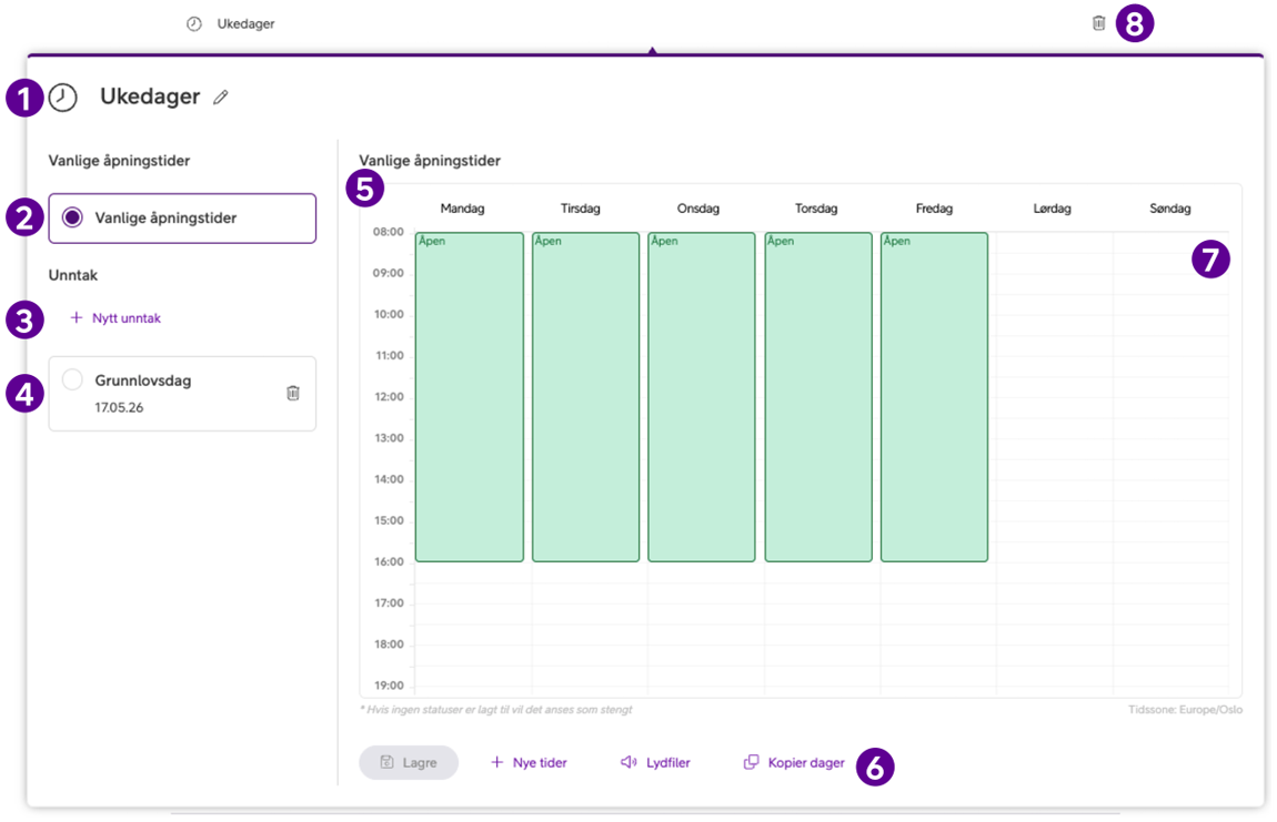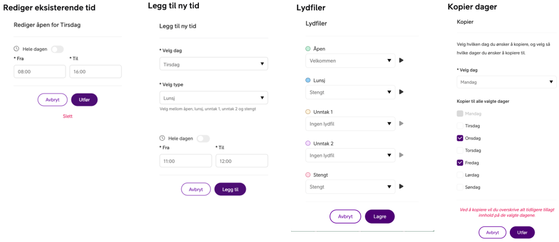 Gå til åpningstider → Velg kategori eller unntak → Klikk på “Lydfiler” → Velg eller last opp opptak → Lagre.