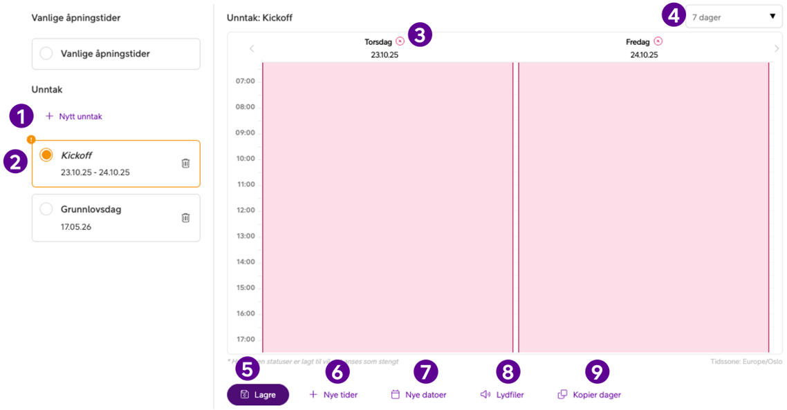 - Lag et unntak: Standard åpningstider er valgt som utgangspunkt. Opprett nye unntak ved å klikke “+ Nytt unntak”, gi det et navn, velg datoer og klikk “Opprett”.