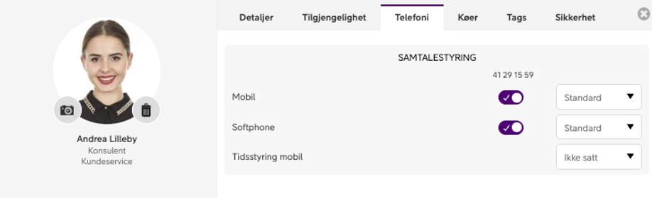 - Foreta samtaleinnstillinger ved innkommende anrop med detaljer for viderekobling per fraværstype, automatisk eller egendefinert fraværsmelding
