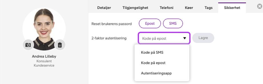 Tofaktorautentisering er obligatorisk for alle brukere i Telia Smart Connect. Administrator kan endre tofaktor-metode ved å velge enten e-post, SMS eller autentiseringsapp og lagre.