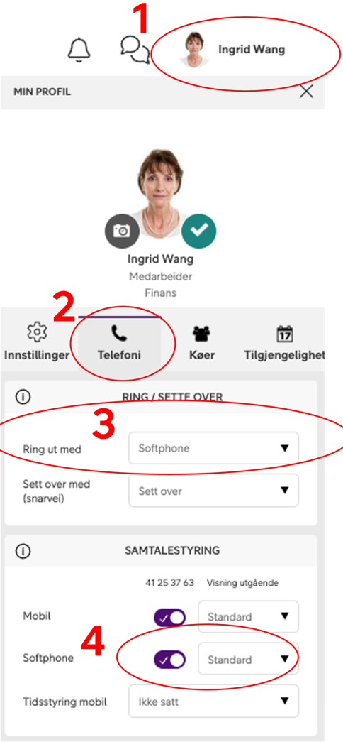 - Gå til Min Profil (1), velg Telefonmenyen (2) og velg deretter Ring ut med softphone (3). Du vil nå kunne ringe ut og motta mobilsamtaler i nettleseren i tillegg til mobiltelefonen.