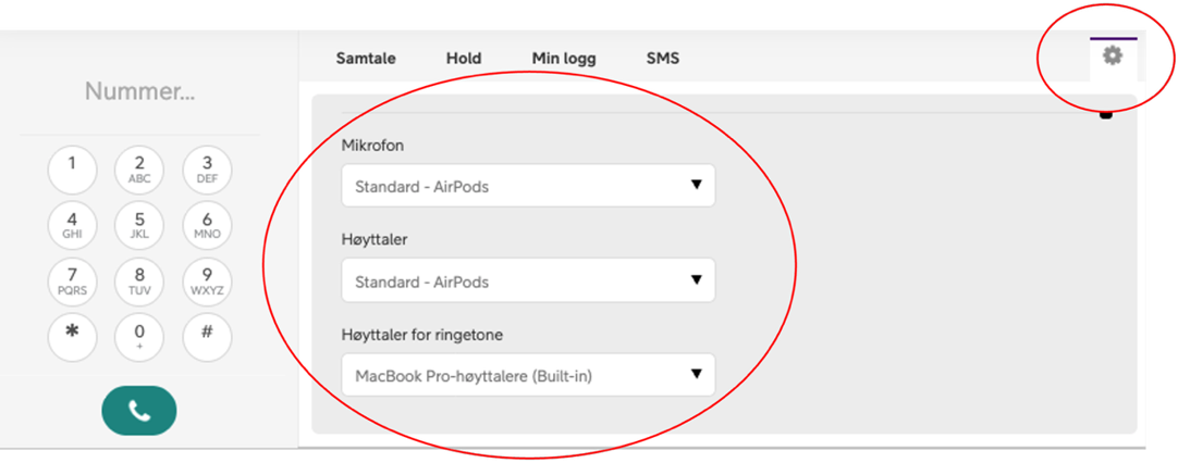 - Under innstillinger i samtalevinduet kan brukeren velge lydenheter og volum for høyttaler, mikrofon og høyttaler for ringetone.