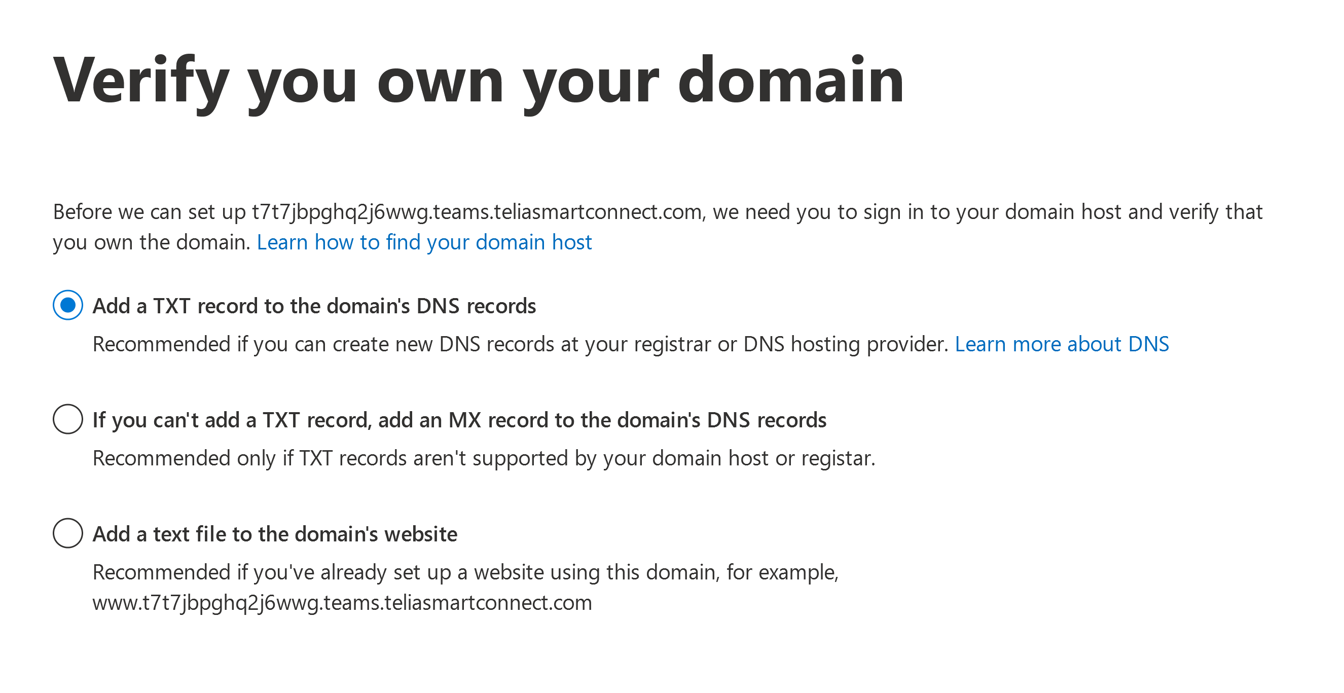 - Velg å verifisere domenet ved å: "Legg til en TXT-post i domenets DNS-oppføringer".