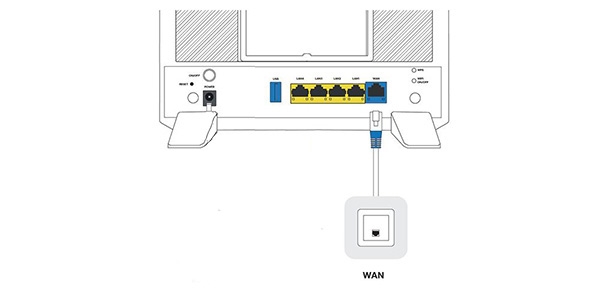 Koble WAN-kabelen (den blå) i WAN-porten på ruteren og i uttaket merket WAN på veggen.